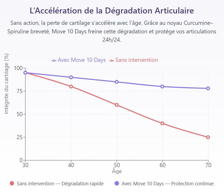 Les douleurs et raideurs articulaires peuvent devenir une fatalité. Malgré tous les efforts (sport, régime, compléments...), l'inconfort s'installe, la mobilité se réduit, et vous vous sentez limité(e). Cette dégradation du cartilage, souvent accélérée par le monde moderne, est frustrante car les solutions classiques n'offrent qu'un soulagement temporaire.